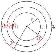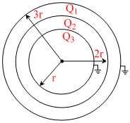 Three concentric conducting spherical shells have radius r, 2r and 3r, and Q1, Q2 and Q3 are final charges respectively. Innermost and outermost shells are already earthed as shown in figure. choose the wrong statement