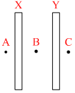 X and Y are large, parallel conducting plates closed to each other. Each face has an area A. X is given a charge Q. Y is without any charge. Points A, B and C are as shown in figure :