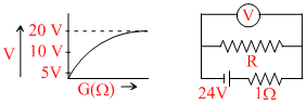 A cell of internal resistance 1Ω is connected across a resister. A voltmeter having variable resistance is used to measure potential difference across resistor. The plot of voltmeter reading V against G is shown. What is value of external resistor R? (G = Resistance of galvanometer)