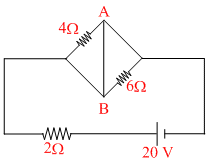 4Ω and 6Ω resistor are short - circuited, Therefore no current will flow through these resistances. Current passing through the battery is I = (20/2) = 10A. This is also the current passing in wire AB from B to A.