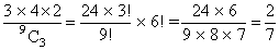 An urn contains nine balls of which three are red, four are blue and two are green. Three balls are drawn at random without replacement from the urn. The probability that the three balls have different colour is