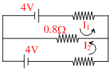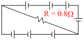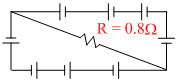 A circuit is comprised of eight identical batteries an a resistor R = 0.8W. Each battery has an emf of 1.0 V and internal resistance of 0.2W. The voltage difference across any of the battery is