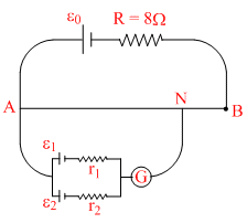 . The cells of small emfs e1 = 2V and e2 = 4V having internal resistance 2Ω and 6Ω respectively, are connected as shown in the figure. If galvanometer shows no deflection at the point N, the distance of point N from the point A is equal to