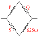 A whetstone′s bridge is balanced with a resistance of 625 Ω in the third arm, where P, Q and S are in the 1st 2nd 4th arm respectively. If P and Q are interchanged, the resistance in the third arm has to be increased by 51Ω to secure balance. The unknown resistance in the fourth arm is