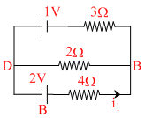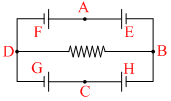 In the circuit shown E, F, G and H are cells of e.m.f 2V, 1V, 3V and 1V respectively and their internal resistances are 2Ω, 1Ω, 3Ω and 1Ω respectively then -