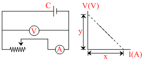 The diagram besides shows a circuit used in an experiment to determine the emf and internal resistance of the cell C. A graph was plotted of the potential difference V between the terminals of the cell against the current I, which was varied by adjusting the rheostat. The graph is shown on the right; x and y are the intercepts of the graph with the axes as shown. What is the internal resistance of the cell ?