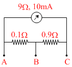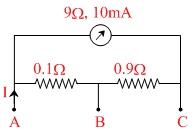 A millimeter of range 10mA and resistance is joined in a circuit as shown. The meter gives full-scale deflection for current I when A and B are used as its terminals, i.e., current enters at A and leaves at B (C is left isolated). The value of I is