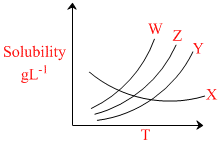 Solubility curves of four ionic salts X, Y, Z, W are given below :