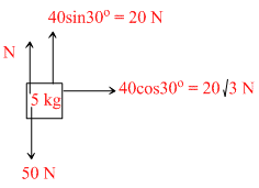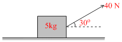 The adjoining figure shows a force of 40N pulling a body of mass 5kg in a direction 30o above the horizontal. The body is in rest on a smooth horizontal surface. Assuming acceleration of free-fall is 10m/s2. Which of the following statements I and II is/are correct ?