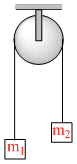 An idea string is passing over a smooth pulley as shown .Two blocks m1 and m2 are connected at the ends of the string. If m1 = 1 kg and tension in the string is 10 N, mass m2 is equal to (g =10 m/s2)