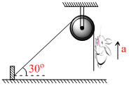 A light string at one end to a clamp on group over a fixed pulley and hangs at the other side. It makes on angle of 30o with the ground . A monkey of mass 5 kg climbs up the rope. The clamp can tolerate a vertical force of 40 N only . The maximum acceleration in upward direction with which the with which the monkey can clump safely is (neglect friction and take g = 10 m/s2)