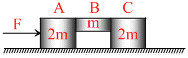 The system is pushed by a force F as shown in figure. All surface are smooth are smooth except between B ans C. Friction coefficient B and. Maximum value of F to prevent block B from downward slipping is friction is