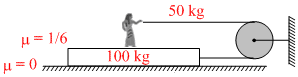 A man of mass 50 kg is pulling on a plank of mass 100 kg kept on a smooth floor as shown with force of 100 N. If both man & plank move together, find force of friction acting on man.