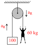 In other to raise a mass of 100 kg a man of mass 60 kg fasten a rope over a smooth pulley. He climbs the rope with an acceleration 5 g/4 relative to rope. the tension in the rope is (g = 10 m/s2)