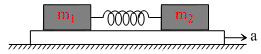 Two block of mass m1 and m2 are connected with a mass less spring and placed over a plank moving with an acceleration ′a′ as show in figure. The coefficient of friction between the blocks and platform is μ.