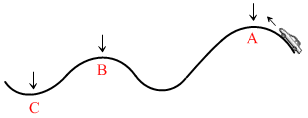 A car is moving along a hilly road as shown (side view). The coefficient friction between the types and pavement is constant and the car maintains steady speed. If at one of the points shown the driver applies the brakes as hard as possible without making the types slip, the magnitude of the friction force immediately after the brakes applied will be maximum if the car was at