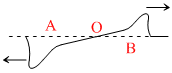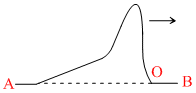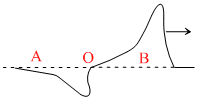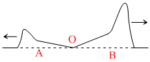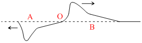 Two strings, A and B, of lengths 4L and L respectively and same mass M each, are tied together to form a knot ′O′ and stretched under the same tension. A transverse wave pulse is sent along the composite string from the side A, as shown to the right. Which of the following diagrams correctly shows the reflected and transmitted wave pulse near the knot ′O′ ?