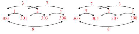 You are given four tuning forks, the lowest frequency of the forks is 300 Hz. By striking two tuning forks at a time any of 1, 2, 3, 5, 7 & 8 Hz beat frequencies are heard. The possible frequencies of the other three forks are -