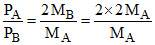 A 0.5 dm3 flask contains gas A and 1 dm3 flask contains gas B at the same temperature. If density of A = 3 g/dm3 and that of B = 1.5 g/dm3 and the molar mass of A = 1/2 of B, the ratio of pressure exerted by gases is :
