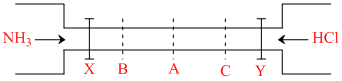 The valves of X and Y are opened simultaneously. The white fumes of NH4Cl will first form at: