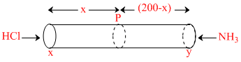 A straight glass tube as shown, has 2 inlets X & Y at the two ends of 200 cm long tube. HCl gas through inlet X and NH3 gas through inlet Y are allowed to enter in the tube at the same time and pressure at a point P inside the tube. The distance of point P from X is :