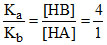 The ratio of dissociation constant of two weak acids HA and HB is 4. At what moar concentration ratio, the two acids will have same pH in separate solutions: