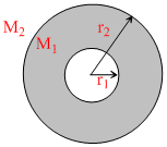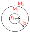 Two concentric shells of masses M1 and M2 are having radii r1 and r2. Which of the following is the correct expression for the gravitational field at a distance r : -