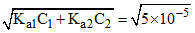 C.The pH of a solution containing 0.1 M HCOOH (Ka = 1.8 × 10-4) and 0.1 M HOCN.