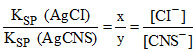 At 25oC, the solubility product values of AgCl and AgCNS are 1.8 × 10-10 and 1.6 × 10-11 respectively. When a solution is saturated with both solids, calculate the ratio [Cl-]/[CNS-] and also [Ag+] in the solution.