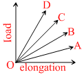 The load versus elongation graph for four wires of the same material and same length is shown in the figure. The thinnest wire is represented by the line