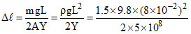 The Young′s modulus of a rubber string 8 cm long and density 1.5 kg/m3 is 5 × 108 N/m2, is suspended on the ceiling in a room. The increase in length due to its own weight will be : -