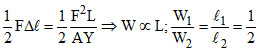 Two wires of same diameter of the same material having the length l and 2l. If the force F is applied on each, the ratio of the work done in the two wires will be : -