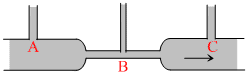 In the figure below is shown the flow of liquid through a horizontal pipe. There tubes A, B and C are connected to the pipe. The radii of the tubes, A, B and C at the junction are respectively 2 cm, 1 cm. and 2 cm. It can be said that the : -