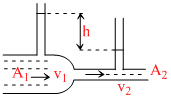 A liquid flows through a horizontal tube. The velocities of the liquid in the two sections, which have areas of cross-section A1 and A2, are v1 and v2 respectively. The difference in the levels of the liquid in the two vertical tubes is h -