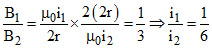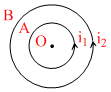 A and B are two concentric circular conductors of centre O and carrying current i1 and i2 as shown in the diagram. If ratio of their radii is 1 : 2 and ratio of the flux densities at O due to A and B is 1 : 3 then the value of
