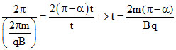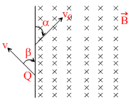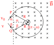 (perpendicular to paper inwards) at P with a velocity v0 at an angle α and leaves the field at Q with velocity v at angle β as shown in fig., then