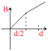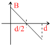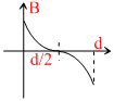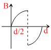 A uniform beam of positively charged particles is moving with a constant velocity parallel to another beam of negatively charged particles moving with the same velocity in opposite direction separated by a distance d. The variation of magnetic field B along a perpendicular lar line draw between the two beams is best represented by