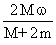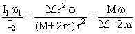 A thin ring of mass M and radius r is rotating about its axis with constant angular velocity ω. Two objects each of mass m are attached gentely to opposite ends of a diameter of the ring. The ring now rotates with angular velocity given by