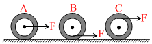 Three spools A, B and C are placed on rough ground and acted by equal force F. Then which of the following statement is incorrect?