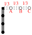 A light rod carries three equal masses A, B and C as shown in figure.