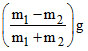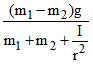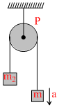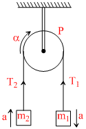 In the figure, the blocks have unequal masses m1 and m2 (m1 > m2). m1 has a downward acceleration a. The pulley P has a radius r, and some mass. The string does not slip on the pulley -