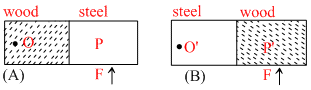 In the figure (A) half of the meter scale is made of wood while the other half of steel. The wooden part is pivoted at O. A force F is applied at the end of steel part. In figure (B) the steel part is pivoted at O’ and the same force is applied at the wooden end : -