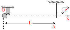 A non uniform rod OA of liner mass density λ = λ0x (λ0 = co nst.) is suspended from ceiling with hinge joint O & light string as shown in figure. Find the angular acceleration of rod just after the string is cut