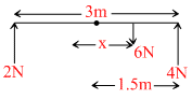 A weightless rod is acted on by upward parallel forces of 2N and 4N at ends A and B respectively. The total length of the rod is AB = 3 m. To keep the rod in equilibrium a force of 6N should act in the following manner : -
