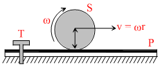 A sphere S rolls without slipping, moving with a constant speed on a plank P. The friction between the upper surface of P and the sphere is sufficient to prevent slipping, while the lower surface of P is smooth and rests on the ground. Initially, P is fixed to the ground by a pin T. If T is suddenly removed-