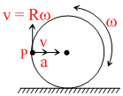A disc of radius R is rolling purely on a flat horizontal surface, with a constant angular velocity. The angle between the velocity and acceleration vectors of point P is