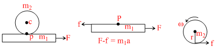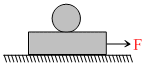 A plank with a uniform sphere placed on it, rests on a smooth horizontal plane. Plank is pulled to right by a constant force F. If the sphere does not slip over the plank