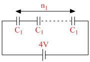 A series combination of n1 capacitors each of capacitance C1 are connected to 4V source as shown in the figure