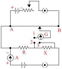 A potentiometer circuit is set up as shown. the potential gradient, across the potentiometer wire, is k volt/cm and the ammeter, present in the circuit reads 1.0 A when two way key is switched off. The balence points, when the key between the terminals (i) 1 and 2 (ii) 1 and 3, pluggedin, are found to be at lengths l1 cm and l2 cmrespectively. The magnitudes, of the resistors R and X, ohm, are then, equal, respectively, to