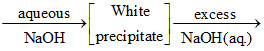 Zn2+ + 2OH- → Zn(OH)2↓ (white) ; Zn(OH)2 + 2OH- → [Zn(OH)4]2-.